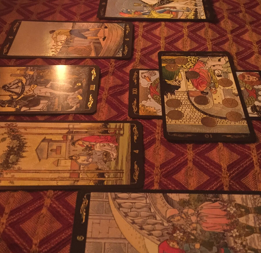 Standard reading using 3 tarot cards, performed intuitively; no oracles or charms.